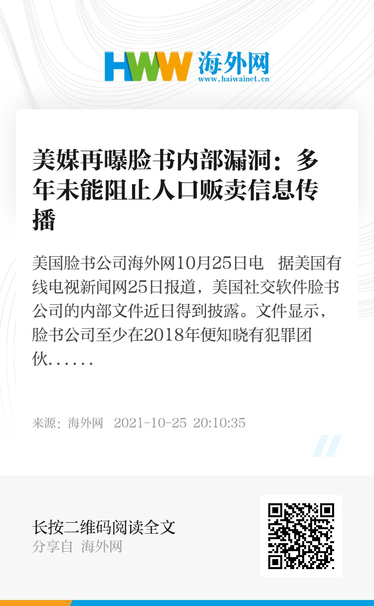 此前《华盛顿邮报》等多家美国媒体就曾报道脸书公司的内部丑闻。美国脸书公司一名前雇员日前向美国证券交易委员会举报称,为了寻求发展,脸书公司网站管理人员故意纵容仇恨言论和虚假信息的存在,理由是打击这些言论的行为将会阻碍脸书公司的发展。(海外网 汪晓宇)