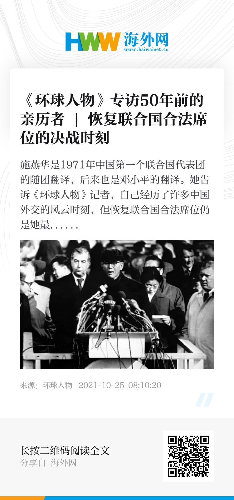 邓小平的翻译、吴建民大使的夫人、1971年中国第一个联合国代表团的随团翻译施燕华告诉《环球人物》记者,她经历了许多中国外交的风云时刻,但恢复联合国合法席位仍是她最难忘、最无法取代的记忆之一。