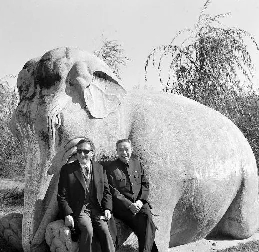 ·1971年10月22日,亨利·基辛格(左)和外交部代部长姬鹏飞在北京十三陵的石象前合影。