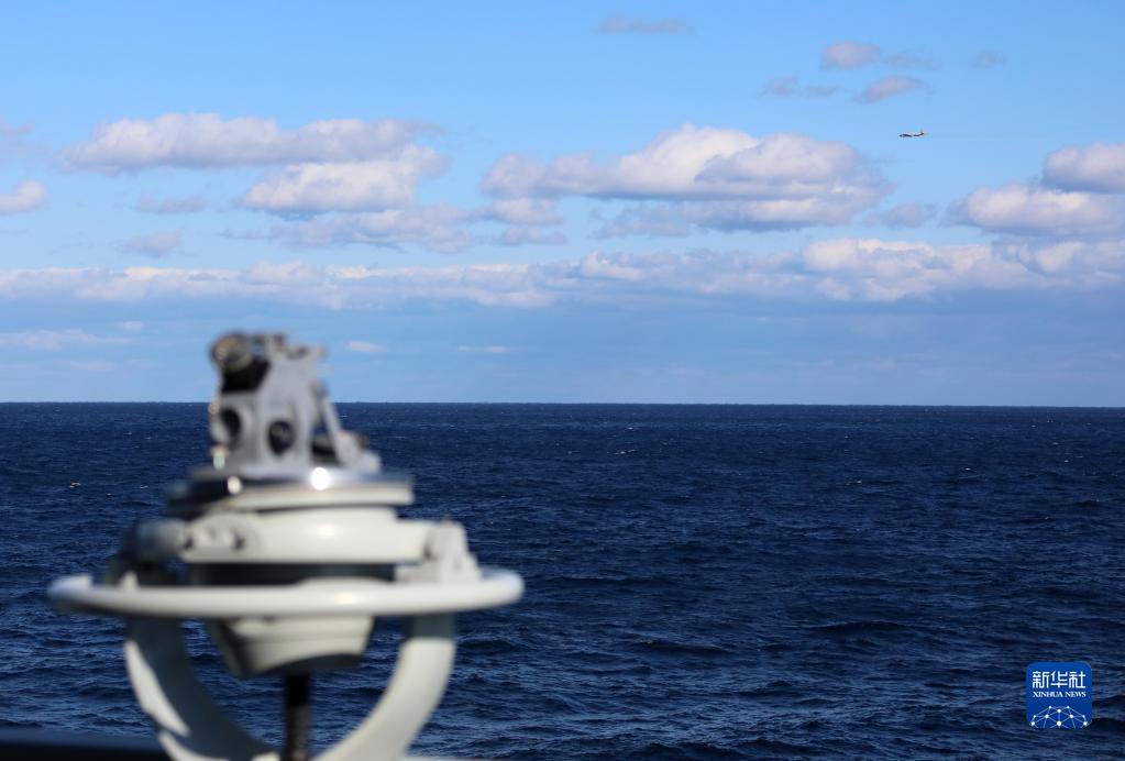 中俄海军联合编队在西太平洋海域联合航渡期间,日自卫队反潜巡逻机(右上)对编队进行侦察(10月18日摄)。 新华社发(李唐 摄)