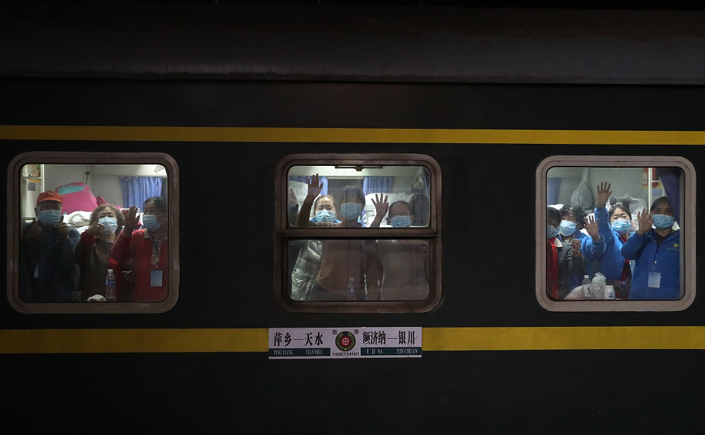 10月25日,因疫情滞留的游客从酒店集中乘车去往石嘴山市火车站。随着10月26日凌晨零点10分宁夏回族自治区石嘴山市石嘴山站旅游专列的发车,因此次疫情滞留在宁夏石嘴山市、中卫市、灵武市的近2000名游客全部踏上归程。据悉,近2000名游客在宁夏进行7天健康观测期间至少做了4轮核酸检测,结果全部为阴性。图片来源:人民视觉