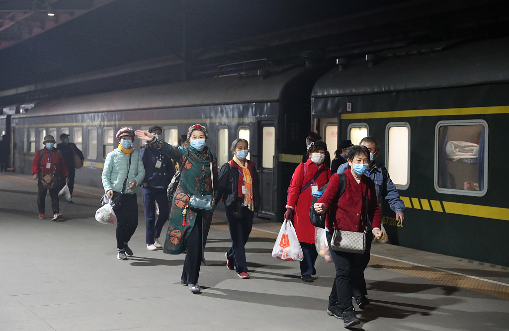 10月25日,因疫情滞留的游客从酒店集中乘车去往石嘴山市火车站。随着10月26日凌晨零点10分宁夏回族自治区石嘴山市石嘴山站旅游专列的发车,因此次疫情滞留在宁夏石嘴山市、中卫市、灵武市的近2000名游客全部踏上归程。据悉,近2000名游客在宁夏进行7天健康观测期间至少做了4轮核酸检测,结果全部为阴性。图片来源:人民视觉