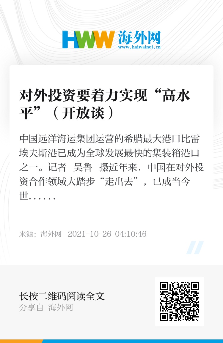 近年来,中国在对外投资合作领域大踏步“走出去”,已成当今世界对外投资第一大国。展望未来,立足积极推进高水平对外开放的现实需要,中国对外投资合作不仅要追求大规模“走出去”,而且要在更高水平上“走出去”。