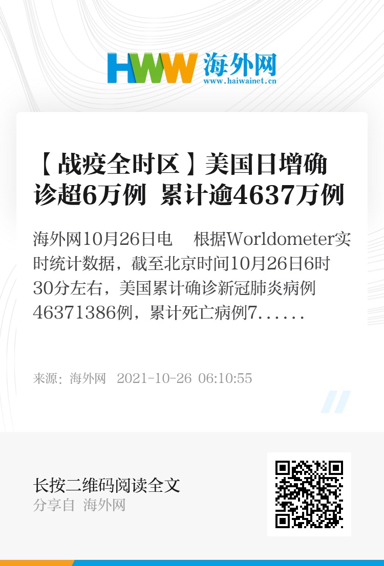 海外网10月26日电 根据Worldometer实时统计数据,截至北京时间10月26日6时30分左右,美国累计确诊新冠肺炎病例46371386例,累计死亡病例757140例。与前一日6时30分数据相比,美国新增确诊病例62328例,新增死亡病例797例。(海外网 张敏)