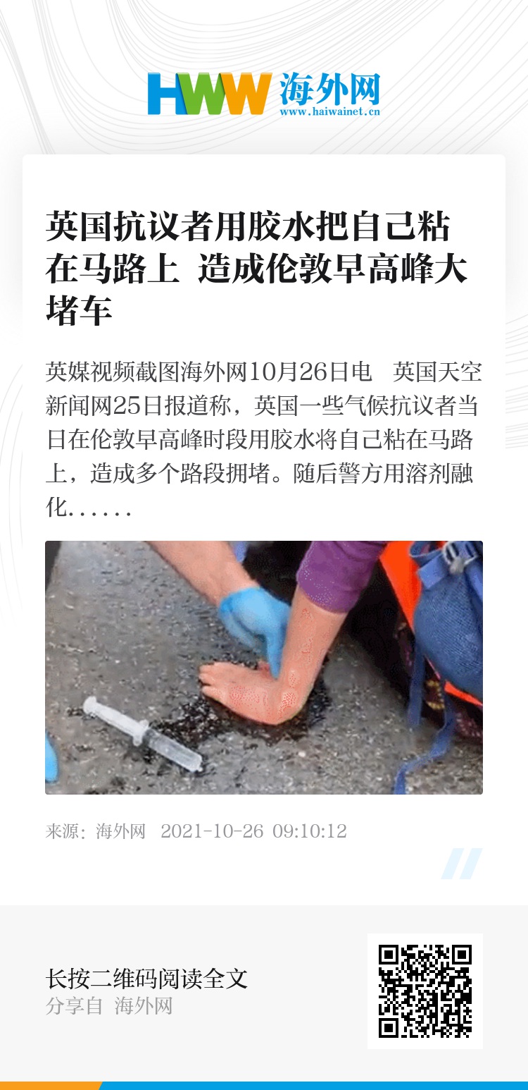 海外网10月26日电 英国天空新闻网25日报道称,英国一些气候抗议者当日在伦敦早高峰时段用胶水将自己粘在马路上,造成多个路段拥堵。随后警方用溶剂融化胶水,将53人逮捕。
