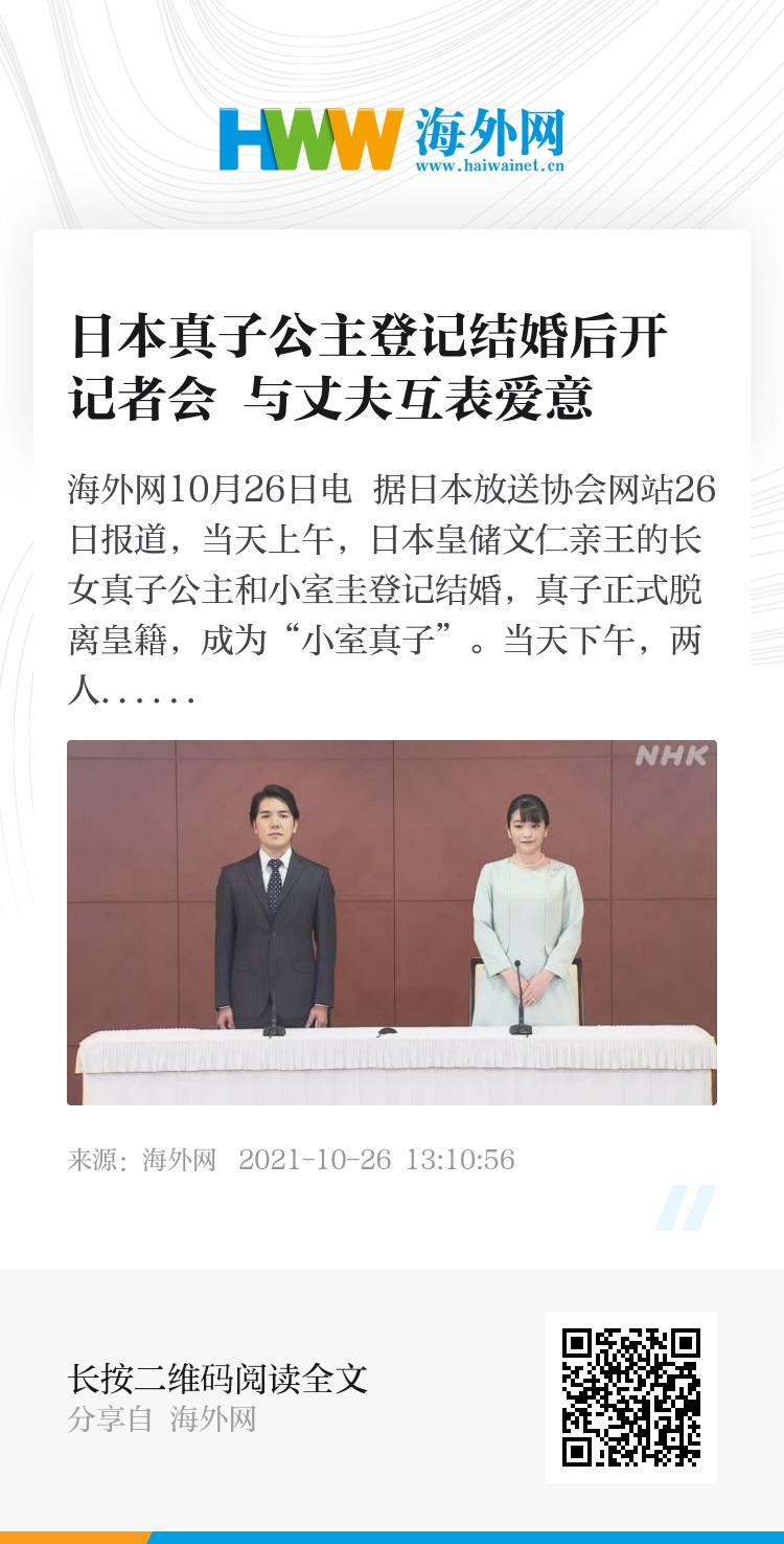 海外网10月26日电 据日本放送协会网站26日报道,当天上午,日本皇储文仁亲王的长女真子公主和小室圭登记结婚,真子正式脱离皇籍,成为“小室真子”。当天下午,两人出席新闻发布会,在发言中互相表达了对对方的爱意。