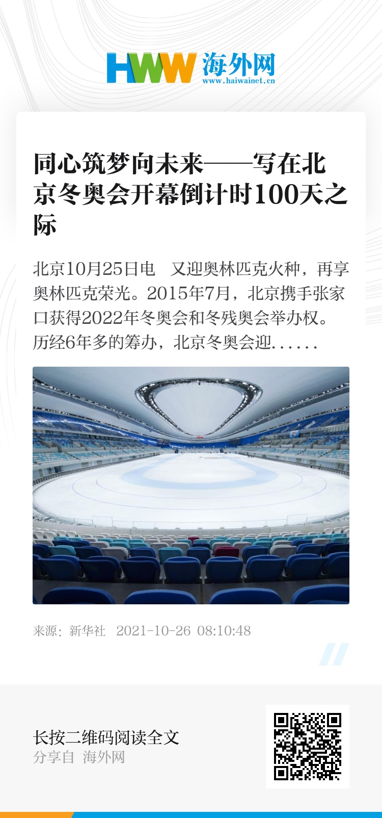 “冰丝带”舞动神州,“雪如意”灵动八方……一个个冬奥地标从蓝图变为现实;工业遗址与冬奥场馆交相辉映,冬奥筹办与首都发展同生共舞……“双奥之城”开启崭新篇章;冰雪运动广泛铺开,冰雪产业全面发展……“带动三亿人参与冰雪运动”的目标照亮美好未来。