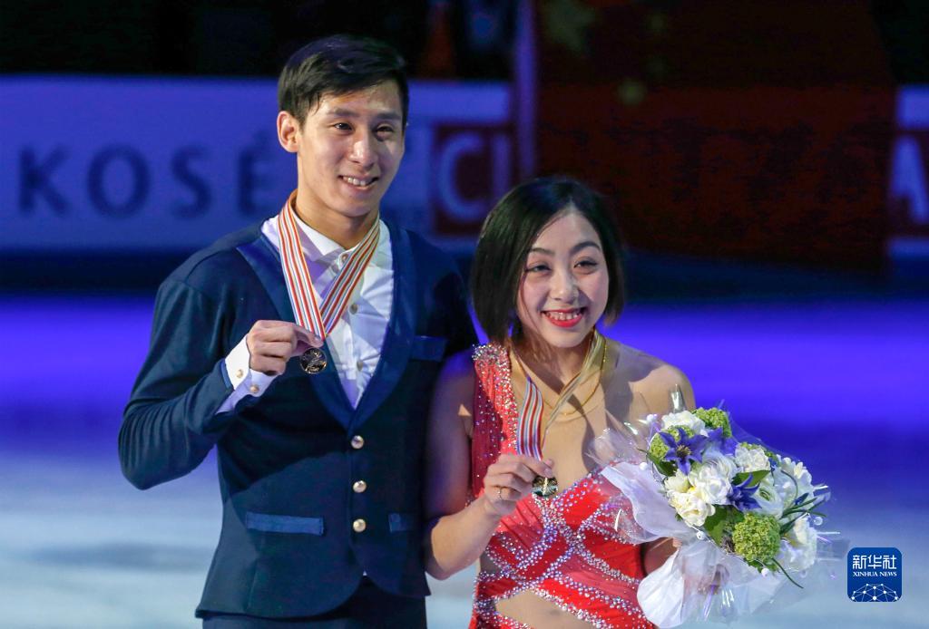 2017年3月30日,隋文静(右)/韩聪在芬兰赫尔辛基举行的2017年花样滑冰世锦赛双人滑比赛颁奖仪式上。新华社发(马蒂凯宁摄)