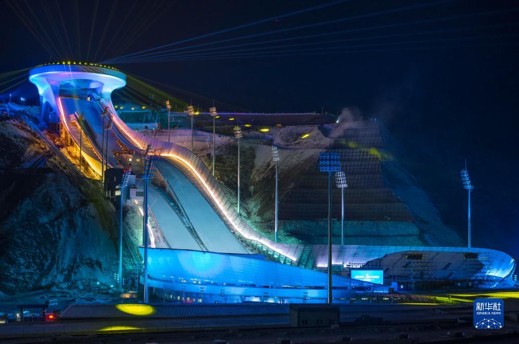 这是位于河北省张家口市崇礼区的国家跳台滑雪中心“雪如意”点亮效果(无人机照片,2020年12月19日摄)。新华社发