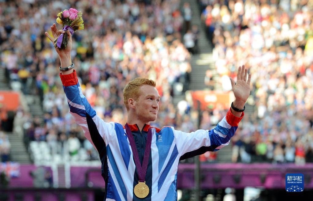 2012年8月5日,英国选手卢瑟福德在2012年伦敦奥运会田径男子跳远决赛颁奖仪式上。新华社记者 杨磊 摄