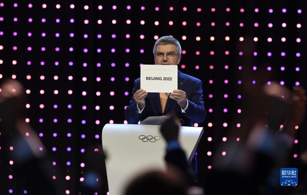 2015年7月31日,国际奥委会主席巴赫在国际奥委会第128次全会上宣布北京携手张家口获得2022年冬奥会举办权。新华社记者 公磊 摄