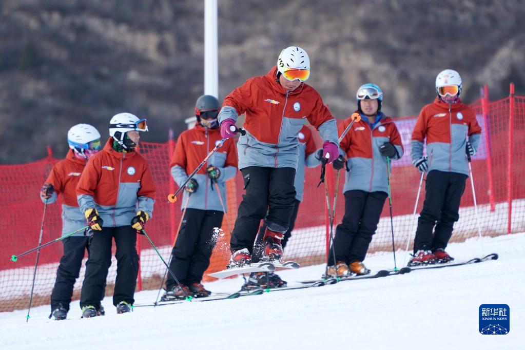 2017年12月7日,北京延庆区张山营镇海坨滑雪队成员在雪道上训练。新华社记者 鞠焕宗 摄