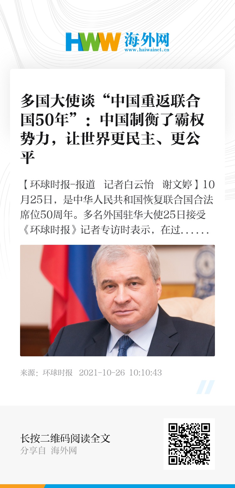【环球时报-环球网报道 记者白云怡 谢文婷】10月25日,是中华人民共和国恢复联合国合法席位50周年。多名外国驻华大使25日接受《环球时报》记者专访时表示,在过去五十年中,中国使联合国机制变得更加民主化、公平化,也使世界秩序变得更加平衡,提高了发展中国家在世界上的代表性。