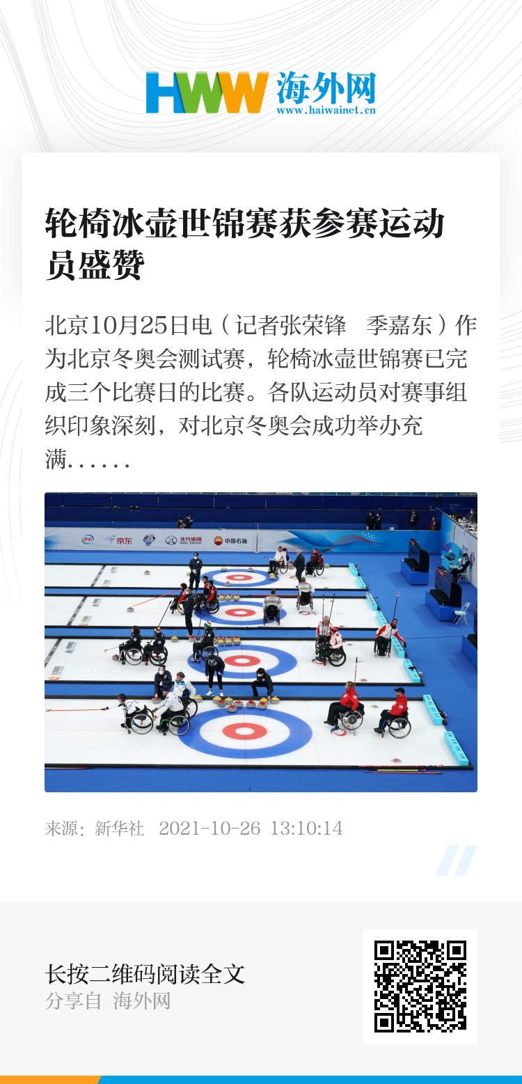 新华社北京10月25日电(记者张荣锋 季嘉东)作为北京冬奥会测试赛,轮椅冰壶世锦赛已完成三个比赛日的比赛。各队运动员对赛事组织印象深刻,对北京冬奥会成功举办充满信心。