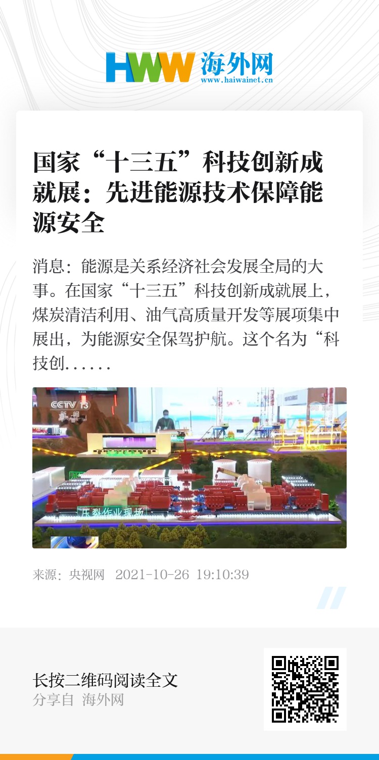 央视网消息:能源是关系经济社会发展全局的大事。在国家“十三五”科技创新成就展上,煤炭清洁利用、油气高质量开发等展项集中展出,为能源安全保驾护航。