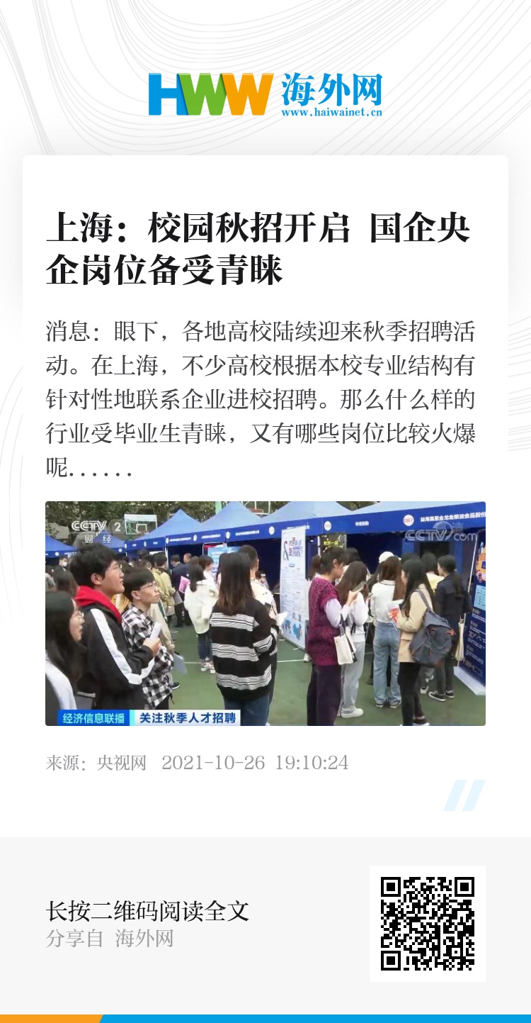 央视网消息:眼下,各地高校陆续迎来秋季招聘活动。在上海,不少高校根据本校专业结构有针对性地联系企业进校招聘。那么什么样的行业受毕业生青睐,又有哪些岗位比较火爆呢?