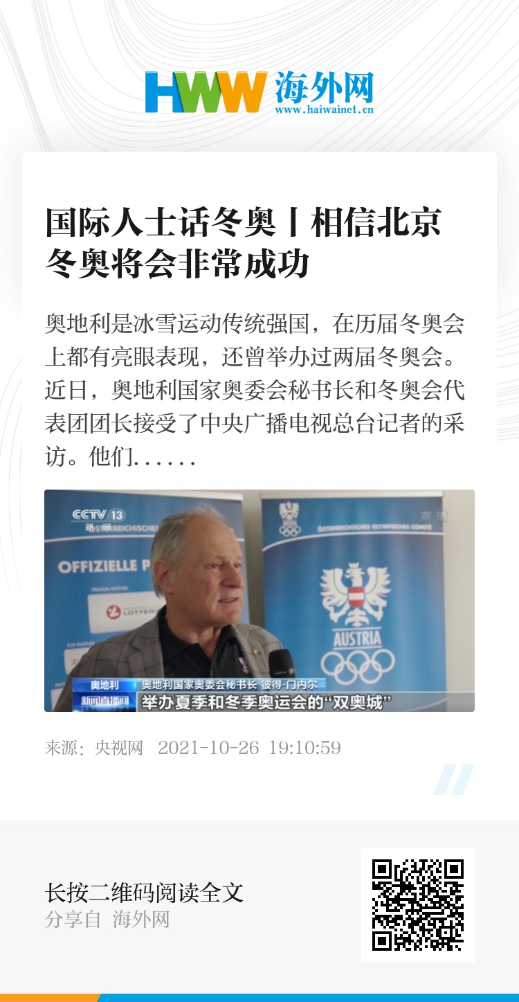 奥地利国家奥委会秘书长 彼得·门内尔:2008年北京奥运会组织得非常好,相信2022年北京冬奥会也会一样成功。北京将成为第一个举办夏季和冬季奥运会的“双奥城”,我们奥地利人热爱冬季运动,希望在北京冬奥会上也能取得成功。