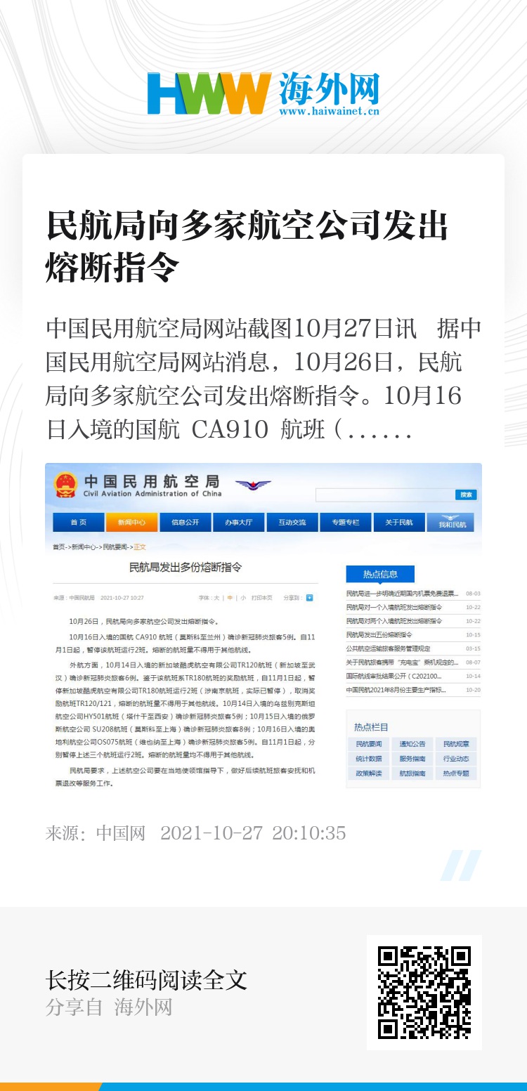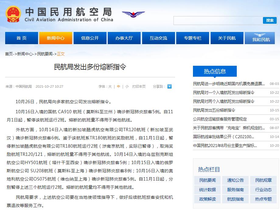 中国网10月27日讯 据中国民用航空局网站消息,10月26日,民航局向多家航空公司发出熔断指令。