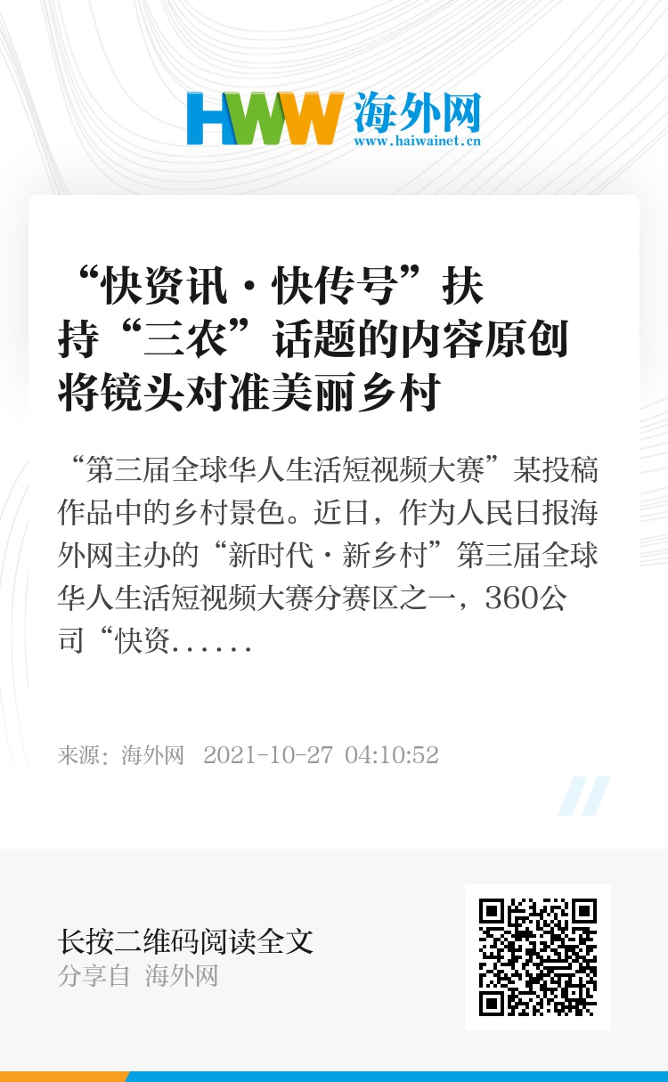 近日,作为人民日报海外网主办的“新时代·新乡村”第三届全球华人生活短视频大赛分赛区之一,360公司“快资讯·快传号”通过招募“三农”领域内容创作者入驻并征集相关作品,吸引了许多“三农”领域作者积极参与。