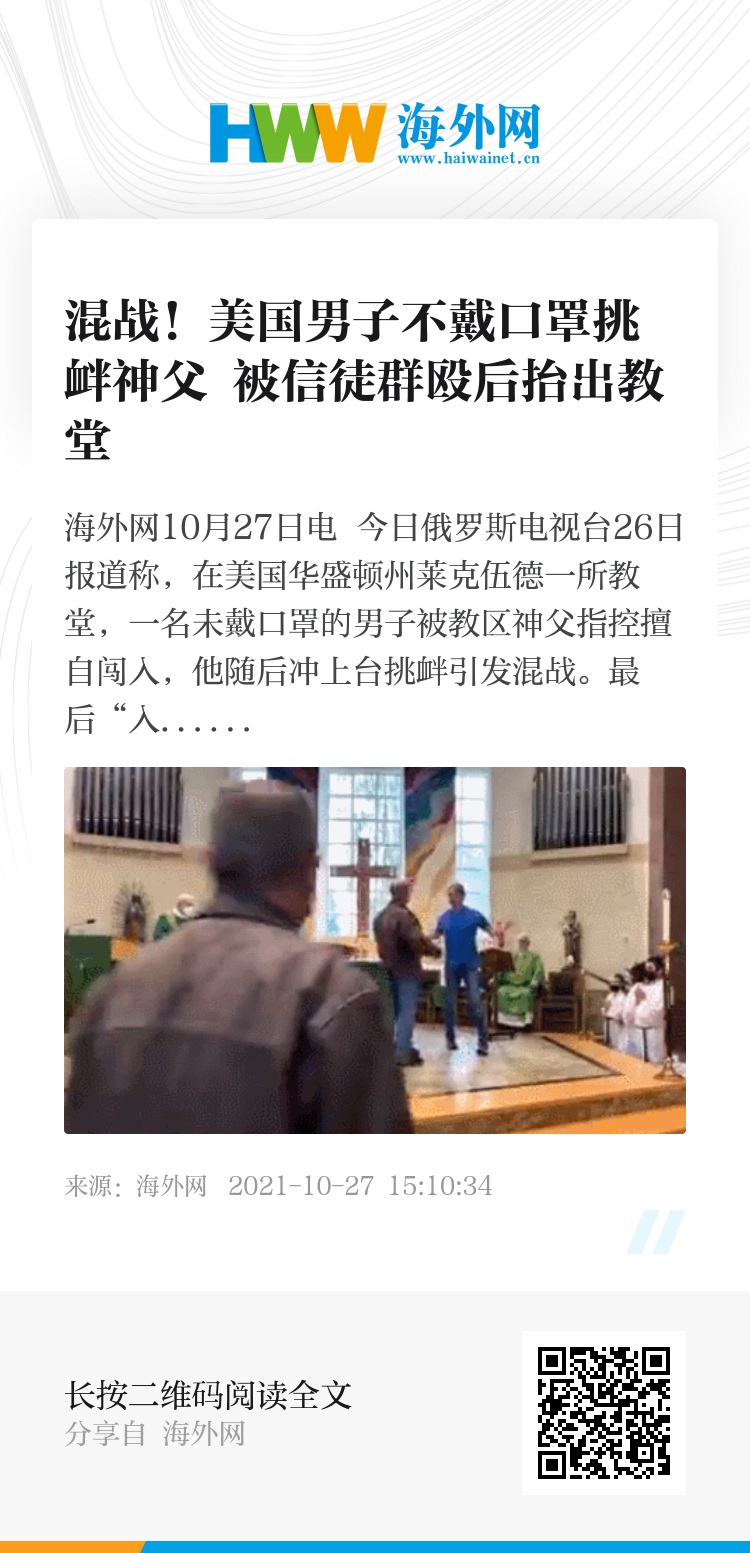 海外网10月27日电 今日俄罗斯电视台26日报道称,在美国华盛顿州莱克伍德一所教堂,一名未戴口罩的男子被教区神父指控擅自闯入,他随后冲上台挑衅引发混战。最后“入侵者”被十几名信徒制服后,抬着拖出教堂。