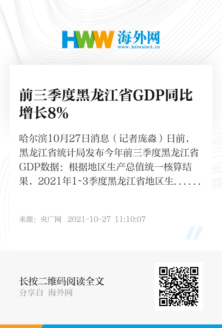 央广网哈尔滨10月27日消息(记者庞淼)日前,黑龙江省统计局发布今年前三季度黑龙江省GDP数据:根据地区生产总值统一核算结果,2021年1~3季度黑龙江省地区生产总值为9747.6亿元,同比增长8%,两年平均增长2.9%。其中,第一产业增加值为1086.1亿元,同比增长8.1%,两年平均增长5.5%;第二产业增加值为3093.7亿元,同比增长7.7%,两年平均增长3%;第三产业增加值为5567.9亿元,同比增长8.1%,两年平均增长2.4%。