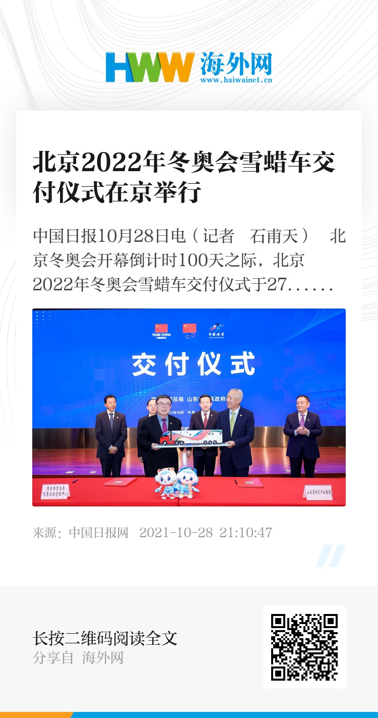 中国日报10月28日电(记者 石甫天) 北京冬奥会开幕倒计时100天之际,北京2022年冬奥会雪蜡车交付仪式于27日在国家体育总局举行。