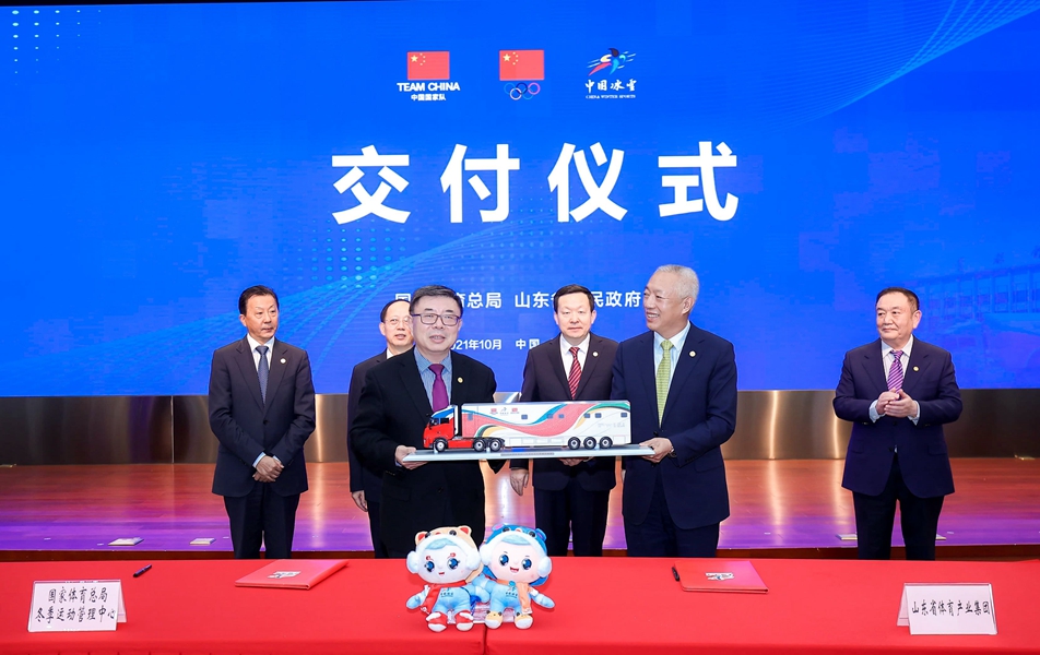 国家体育总局局长苟仲文向山东省及社会各界对中国冰雪健儿的关心支持表示感谢。他表示,当前中国冰雪健儿正在刻苦训练,强弱项、补短板,全力备战北京冬奥会。这其中离不开社会各界的支持帮助,离不开科技创新的强大支撑。在山东省委省政府的领导和山东重工集团、山东体育产业集团等企业的共同努力下,自主创新、研发、生产的国产雪蜡车正式交付。清华大学、航天科技集团、中国中铁集团等知名高校、科研院所和央企、国企都为备战北京冬奥会提供了先进的科技保障。中国冰雪健儿一定会刻苦训练、奋勇拼搏,用“参赛出彩”的优异成绩回报社会各界的关心与支持。