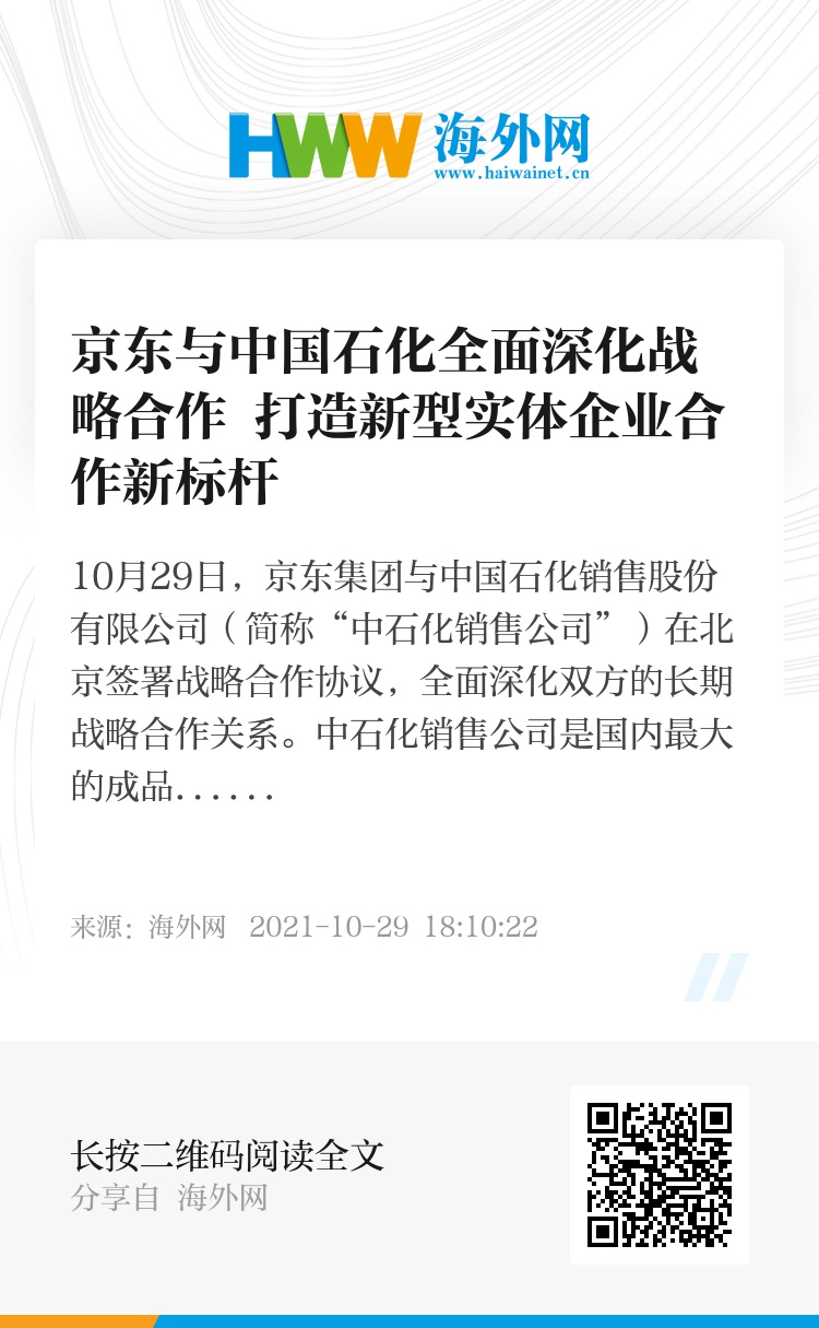 10月29日,京东集团与中国石化销售股份有限公司(简称“中石化销售公司”)在北京签署战略合作协议,全面深化双方的长期战略合作关系。