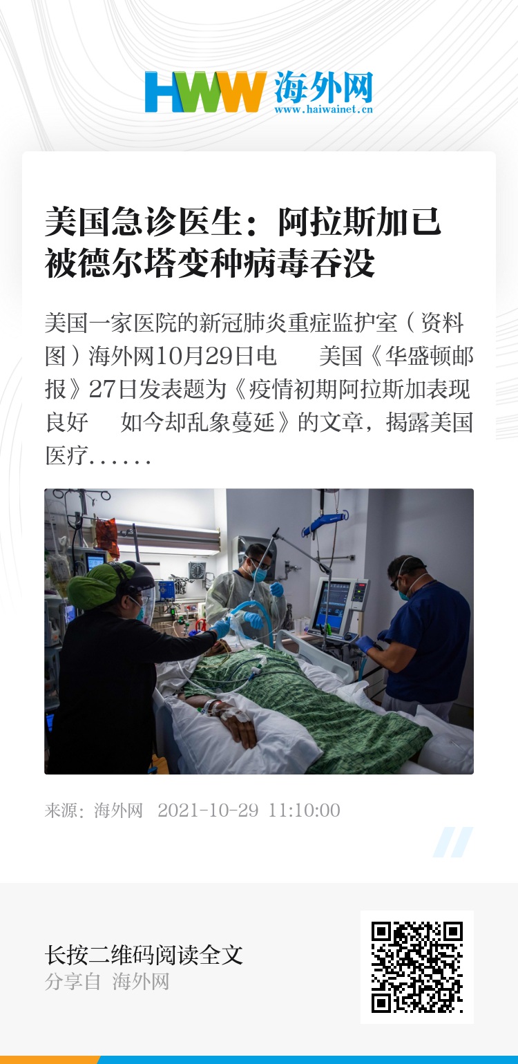 海外网10月29日电 美国《华盛顿邮报》27日发表题为《疫情初期阿拉斯加表现良好 如今却乱象蔓延》的文章,揭露美国医疗系统漏洞。阿拉斯加州首席医疗官在文中指出,该州疫苗接种工作停滞不前,已被德尔塔变异毒株吞没。新冠疫情恰恰暴露了美国医疗系统令人震惊的缺陷——对公共卫生及预防项目投资不足。