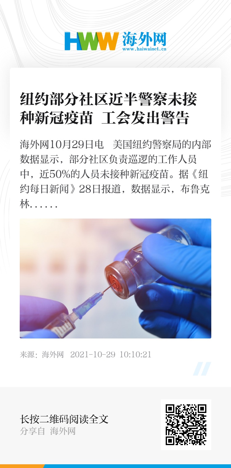 海外网10月29日电 美国纽约警察局的内部数据显示,部分社区负责巡逻的工作人员中,近50%的人员未接种新冠疫苗。