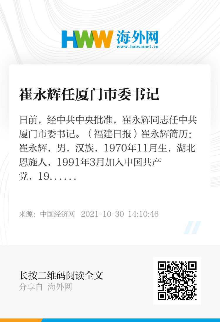 日前,经中共中央批准,崔永辉同志任中共厦门市委书记。(福建日报)