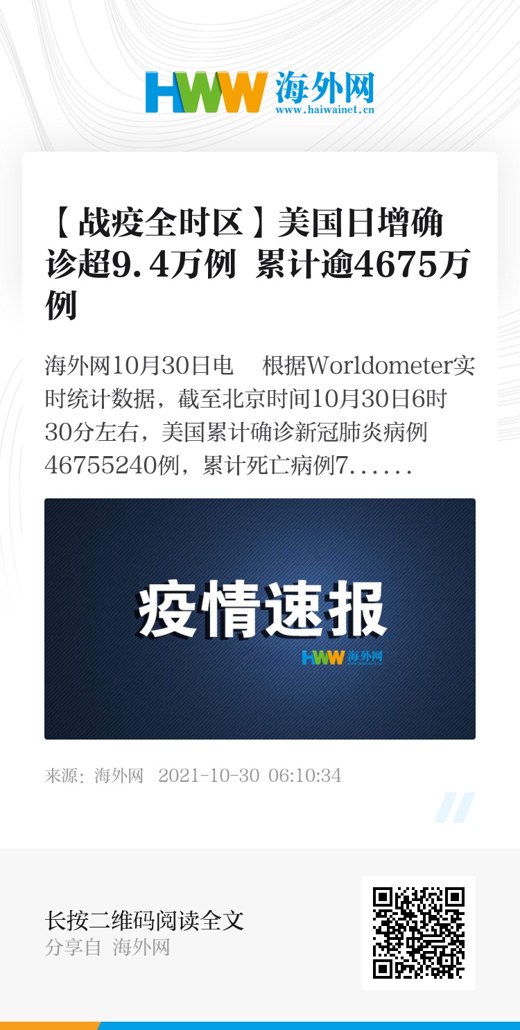 海外网10月30日电 根据Worldometer实时统计数据,截至北京时间10月30日6时30分左右,美国累计确诊新冠肺炎病例46755240例,累计死亡病例765525例。与前一日6时30分数据相比,美国新增确诊病例94947例,新增死亡病例2523例。(海外网 杨佳)
