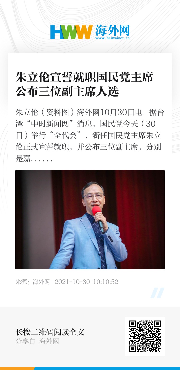 海外网10月30日电 据台湾“中时新闻网”消息,国民党今天(30日)举行“全代会”,新任国民党主席朱立伦正式宣誓就职,并公布三位副主席,分别是嘉义市长黄敏惠、国民党“对外关系协会”会长夏立言、以及国民党青年发展基金会董事长连胜文。