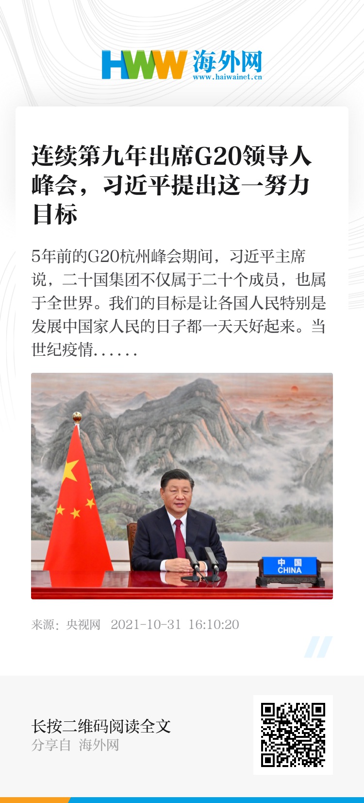 今年是G20的第16次峰会。从2013年9月俄罗斯圣彼得堡峰会以来,习近平主席亲自出席了历年的峰会。疫情发生后,G20分别在去年3月、今年5月举行了应对新冠肺炎特别峰会和全球健康峰会,习主席也都以视频方式出席并发表重要讲话。