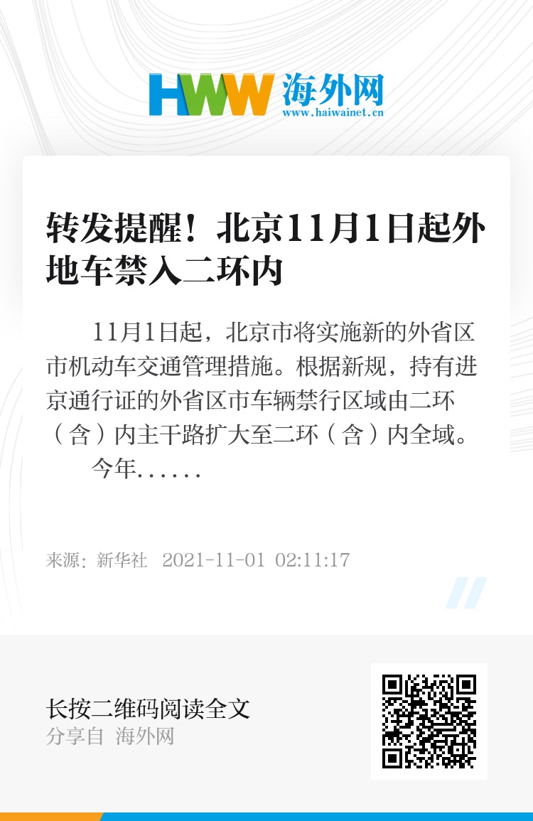 11月1日起,北京市将实施新的外省区市机动车交通管理措施。根据新规,持有进京通行证的外省区市车辆禁行区域由二环(含)内主干路扩大至二环(含)内全域。