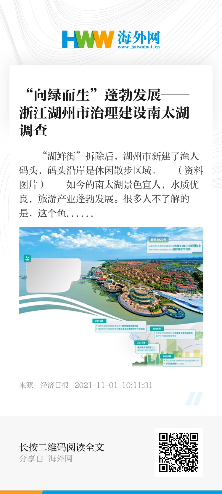 “治理南太湖,需要先治水;水治理好了,才能更好地开发南太湖。”湖州市委书记王纲表示。过去5年,湖州通过项目联审机制,累计否决了650多个不符合环保要求和产业导向的项目,涉及投资800多亿元。