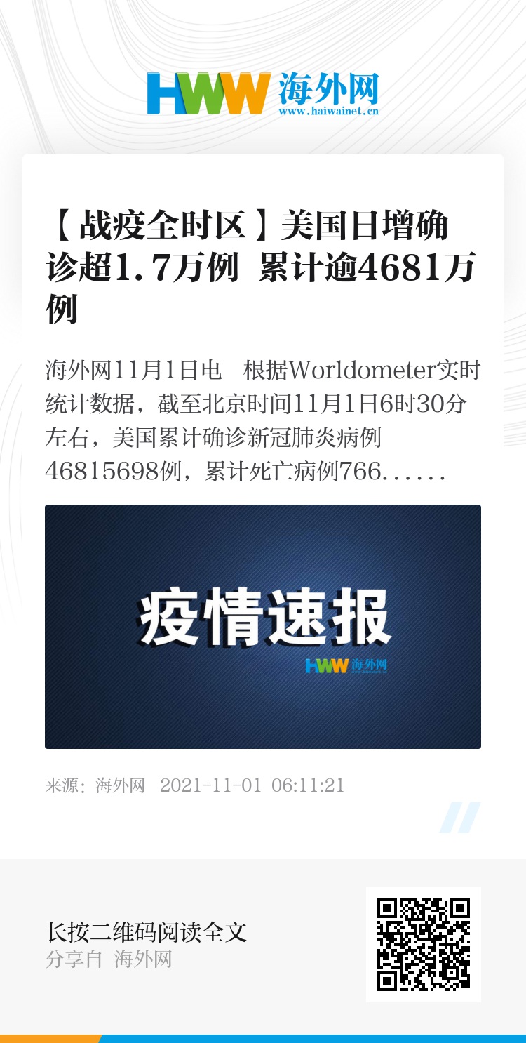 海外网11月1日电 根据Worldometer实时统计数据,截至北京时间11月1日6时30分左右,美国累计确诊新冠肺炎病例46815698例,累计死亡病例766266例。与前一日6时30分数据相比,美国新增确诊病例17829例,新增死亡病例172例。(海外网 李萌)