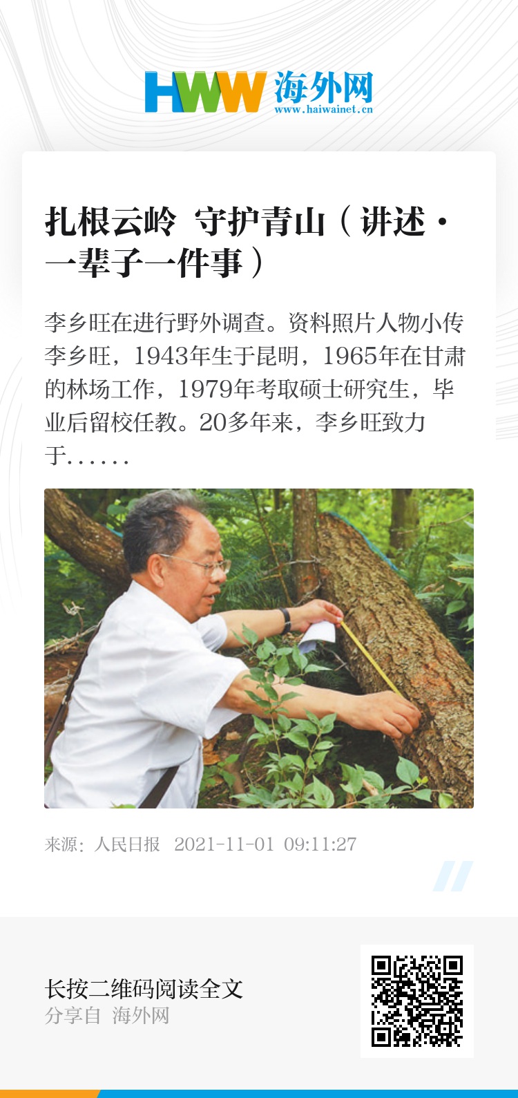 “在林场14年的经历,对我的人生影响很大。”李乡旺回忆,1965年大学毕业后,他被分配到甘肃,在岷山脚下白龙江边的一个林场工作,担任营林技术员。李乡旺所在的地区,每年有将近一半的时间都在下雪。采种、育苗、造林……踏雪翻山,李乡旺一干就是14年。其间,他所在的营林队栽种了2万多亩云杉和冷杉,如今已蔚然成林。