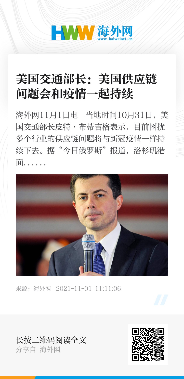 海外网11月1日电 当地时间10月31日,美国交通部长皮特·布蒂吉格表示,目前困扰多个行业的供应链问题将与新冠疫情一样持续下去。