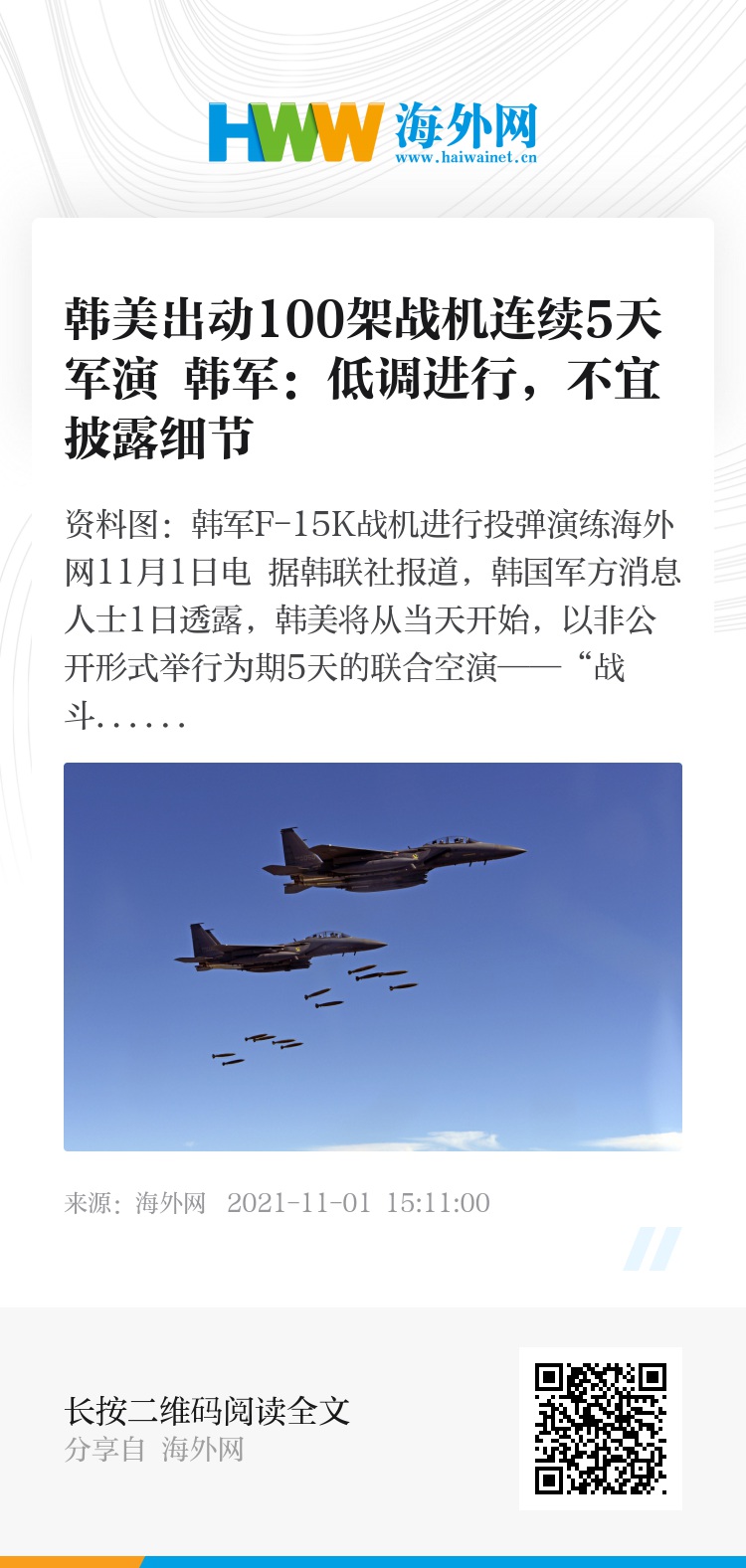 海外网11月1日电 据韩联社报道,韩国军方消息人士1日透露,韩美将从当天开始,以非公开形式举行为期5天的联合空演——“战斗准备态势综合演习”。两国军方此前没有对外公布日程,演习将低调举行。