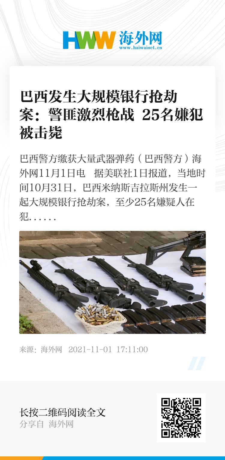 海外网11月1日电 据美联社1日报道,当地时间10月31日,巴西米纳斯吉拉斯州发生一起大规模银行抢劫案,至少25名嫌疑人在犯罪行动中被击毙。