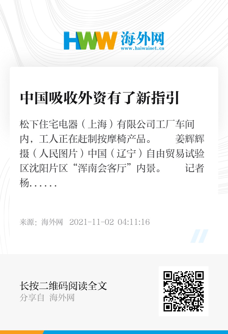 相关人士指出,《规划》强调更大力度推动高水平对外开放、更加有效吸引和利用外资,提出压减外商投资准入负面清单、放宽重点领域准入门槛等举措,为新时期利用外资工作提供了指引,将为外商长期在华投资提供更多机遇和支撑。