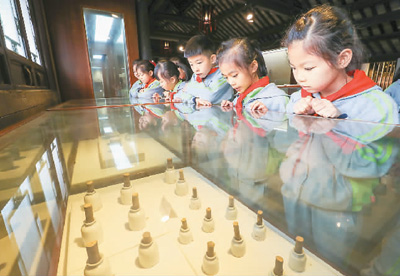 10月21日,浙江省湖州市德清县钟管镇中心学校学生在参观潘氏外科中医博物馆,了解中药知识。 王 正摄(人民视觉)