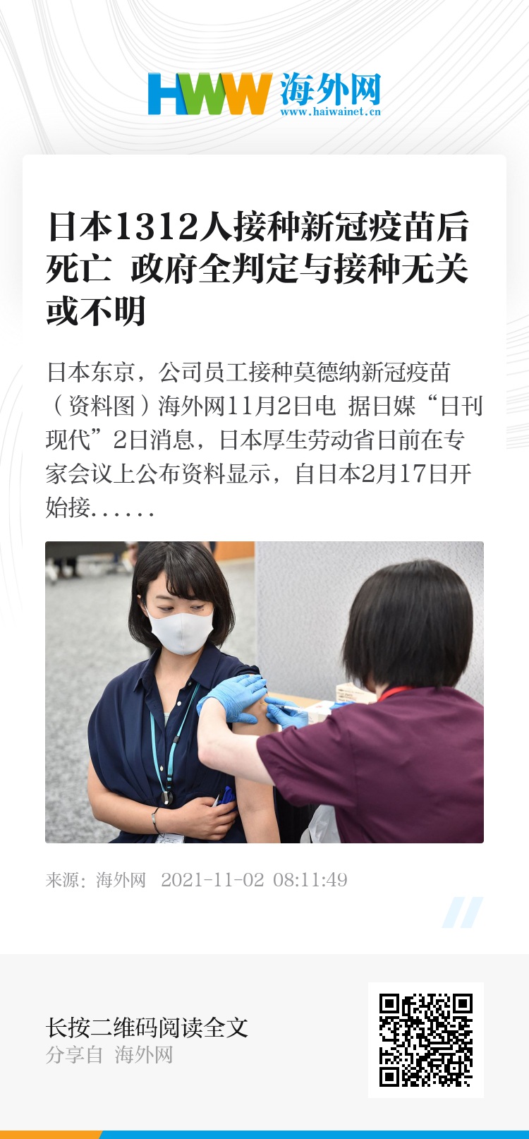 根据资料,2月17日至10月3日,日本政府收到1255起接种后立即死亡的案例报告,其中接种辉瑞疫苗后死亡的1218起,接种莫德纳疫苗的37起。政府还收到57起接种新冠疫苗后15天内死亡报告(辉瑞疫苗50起,莫德纳疫苗7起)。也就是说,241天时间内,接种疫苗后死亡案例共计1312起。