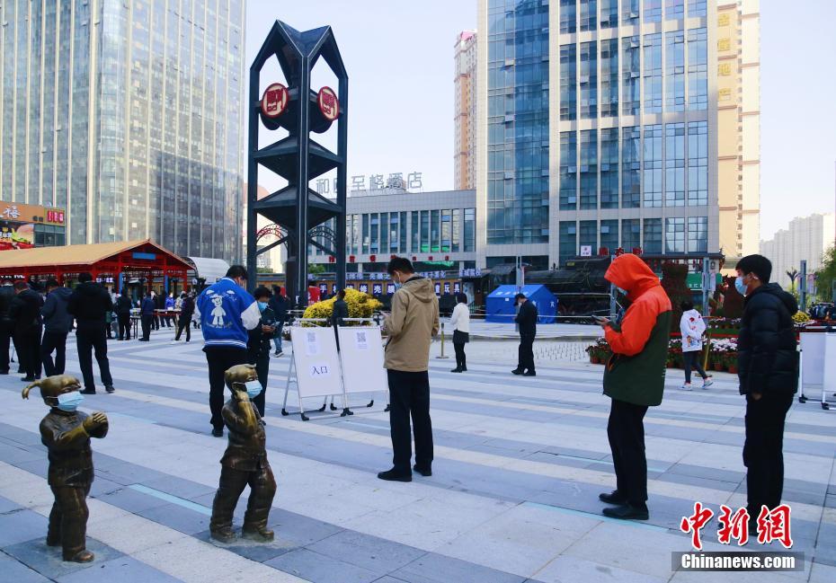11月2日,青海省西宁市城西区一核酸检测采样点,居民有序排队进行核酸检测。当日,根据西宁市疫情防控工作需要,城西区开展全员核酸检测,共设置121个核酸检测采样点,方便居民就近检测,减少聚集。中新社记者 马铭言 摄