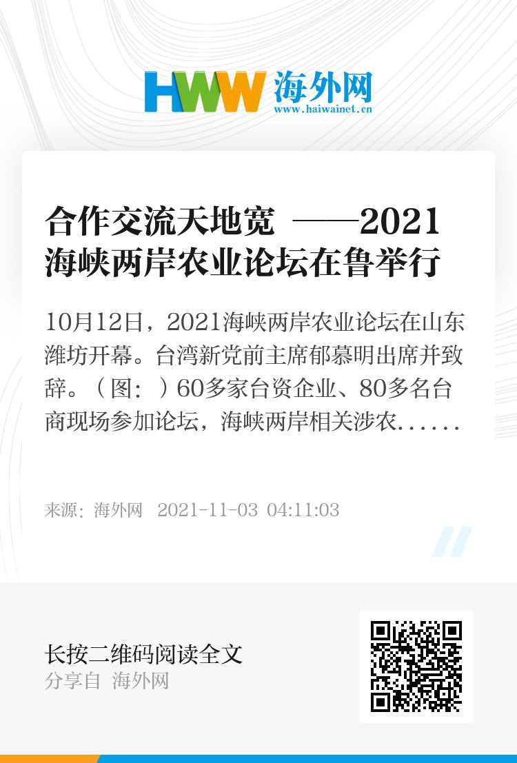 60多家台资企业、80多名台商现场参加论坛,海峡两岸相关涉农单位、企业、机构的代表共计1万余人线上参会……以“深化两岸农业交流合作 打造乡村振兴齐鲁样板”为主题的2021海峡两岸农业论坛日前在山东省潍坊市举办。参会台商与专家学者围绕精致农业、创意农业、智慧农业、农产品深加工等领域,就深化两岸农业交流合作深入研讨和交流。