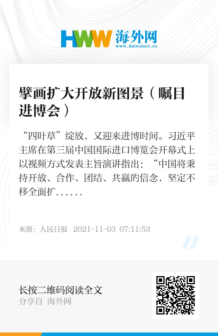 从首届进博会宣布进一步扩大开放的“五大举措”,到第二届进博会重申中国坚持以开放促改革、促发展、促创新,持续推进更高水平的对外开放,再到第三届进博会宣布中国全面扩大开放新举措,中国坚定不移全面扩大开放,不断以中国的新发展为世界提供新机遇。