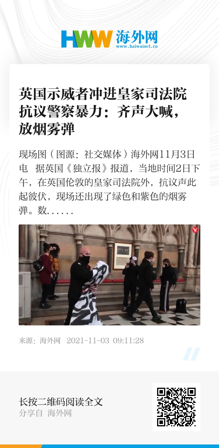 海外网11月3日电 据英国《独立报》报道,当地时间2日下午,在英国伦敦的皇家司法院外,抗议声此起彼伏,现场还出现了绿色和紫色的烟雾弹。数十名抗议者来到皇家司法院附近,表达他们对警察暴力行为的不满。抗议者冲进这座有着百年历史的欧洲最大法院之一,递交了一封投诉信,谴责警察对待女性的暴行。