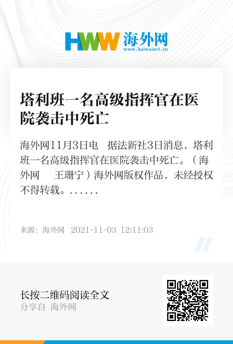 海外网11月3日电 据法新社3日消息,塔利班一名高级指挥官在医院袭击中死亡。(海外网 王珊宁)