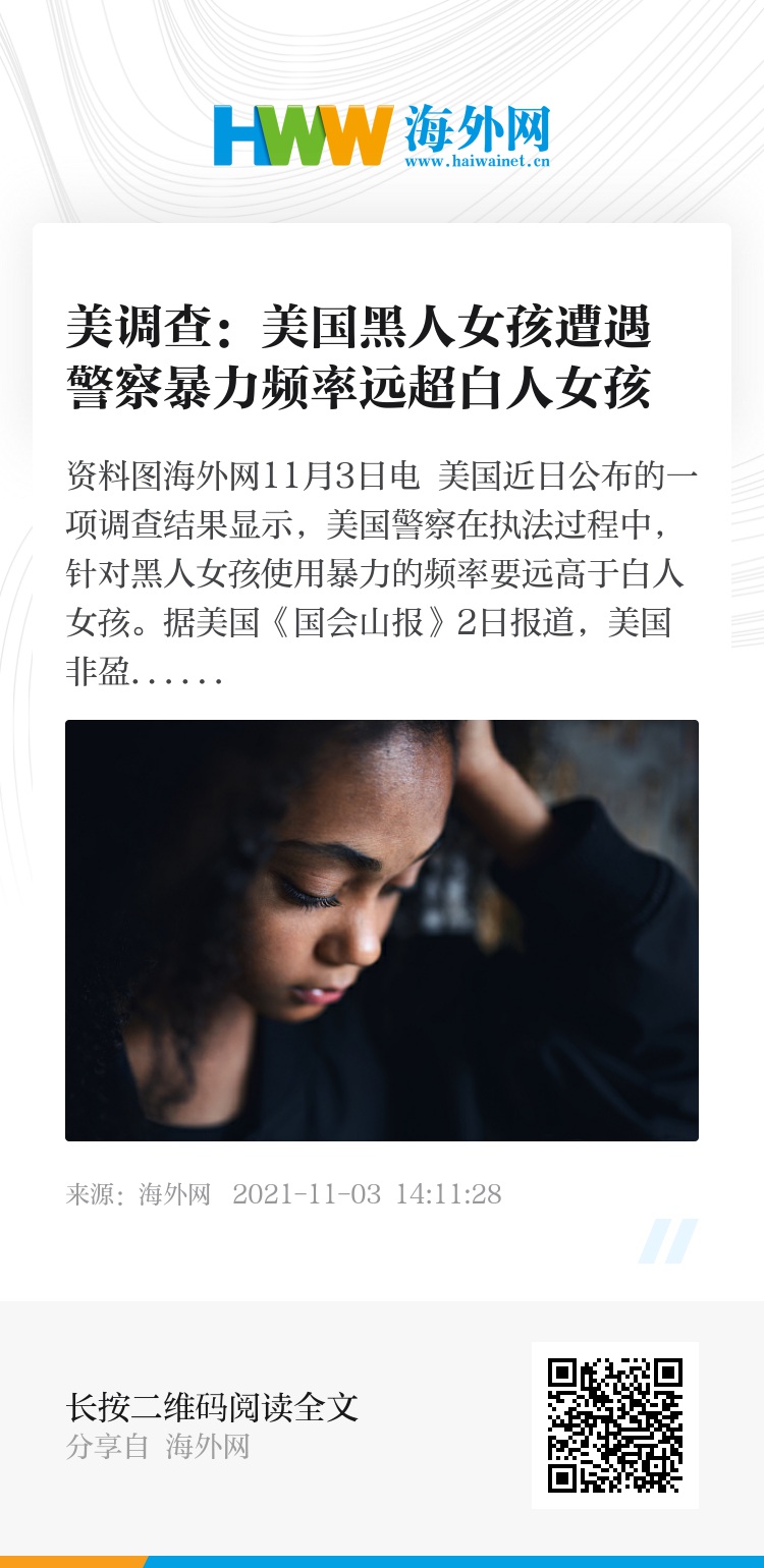 海外网11月3日电 美国近日公布的一项调查结果显示,美国警察在执法过程中,针对黑人女孩使用暴力的频率要远高于白人女孩。